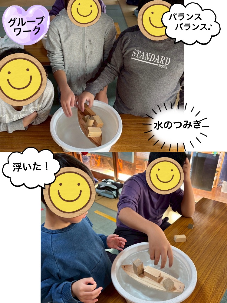 グループワークでは、水のつみきを使い船に見立てつみきを積み重ねました。木の重さが違うのでどこに乗せたらバランスを取れるか考え、お友だちと協力しながらの活動♡全部パーツを乗せられた時の喜び、崩れ落ちて船が沈没した時の落胆を感じながら何度もチャレンジしておりました😊