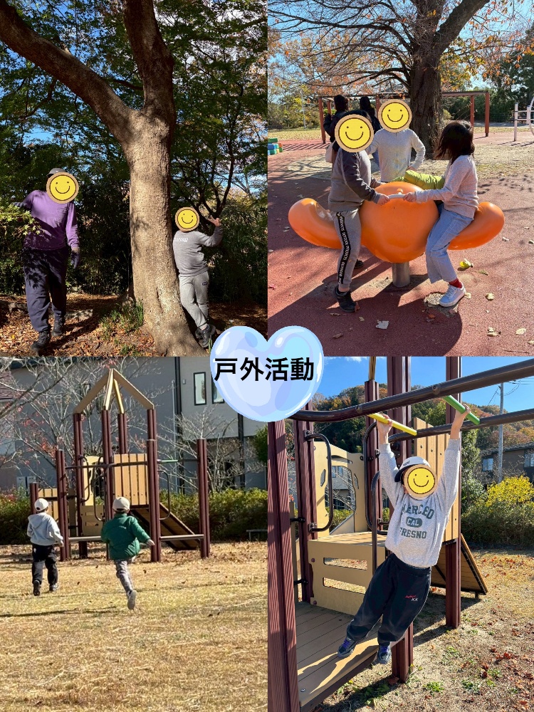戸外活動では、早速大木を見つけ「これ何の木だろ?」と興味津々。自然に触れながら発散いたしました♡