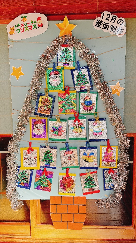 12月の壁面制作は、ステンドグラス風クリスマス制作♡「持ち帰りたい!」との声が多かったんですが、飾らせていただくことの了承を得て、みんなでひとつのクリスマスツリーに仕上げました😊