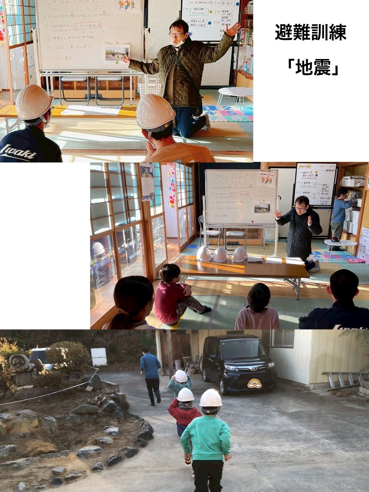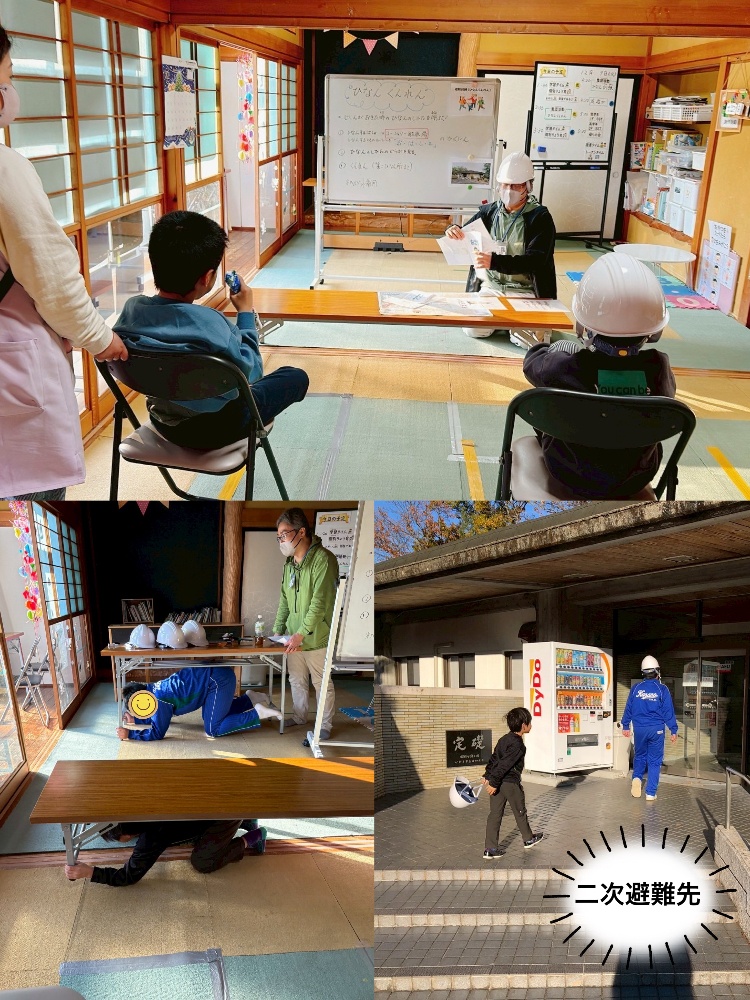 地震を想定して、避難場所の確認、ヘルメットの着用などの訓練を通じて防災意識を高めます。