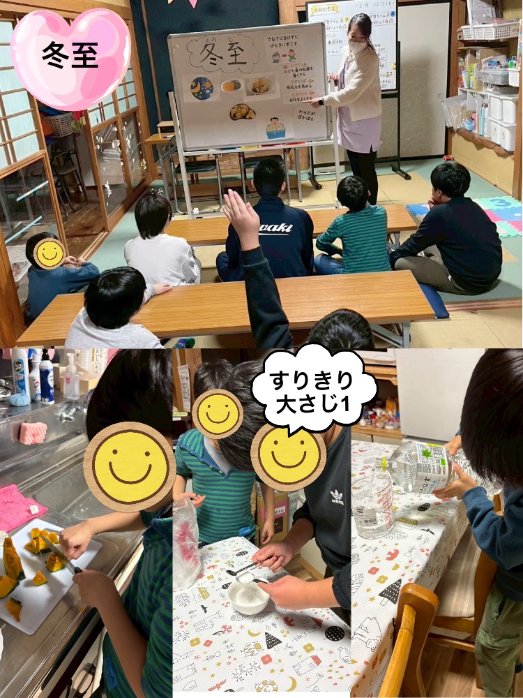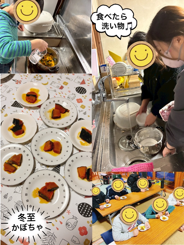 戸外活動から帰ってきてから、冬至かぼちゃを職員もみんなでいただきました😊寒さに負けず、元気に過ごせますように♡