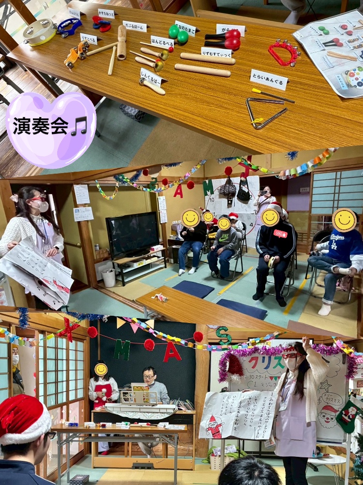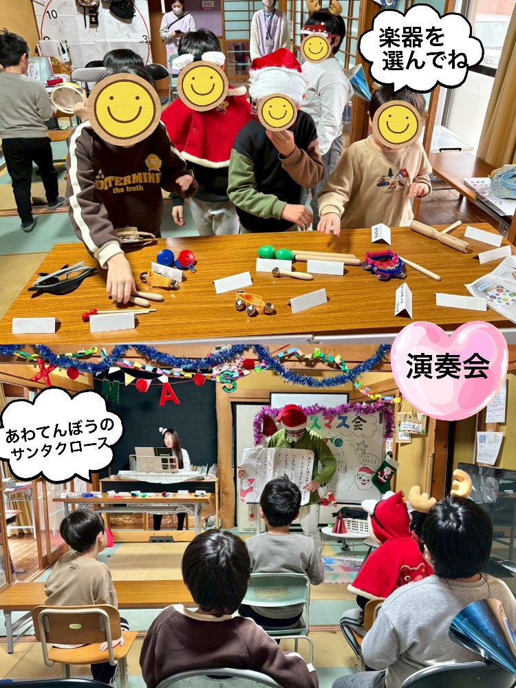 お次は、演奏会🎵「あわてんぼうのサンタクロース」の合奏唱を♡好きな楽器を選びみんなで演奏いたしました😊